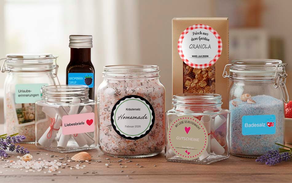 Selbstgemachte Geschenke sind oft die schönsten – vor allem, wenn sie mit Liebe befüllt und persönlich beschriftet sind. Ein Glas mit selbstgemachter Marmelade, leckerem Erdbeerzucker, eigen kreierten Badesalt oder kleinen Liebesbotschaften kann mehr sagen als jede gekaufte Kleinigkeit.