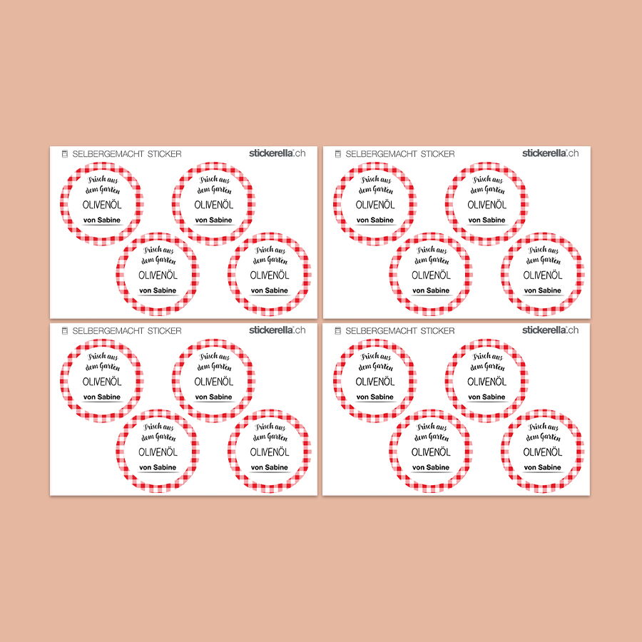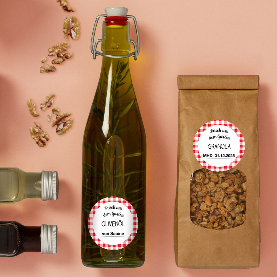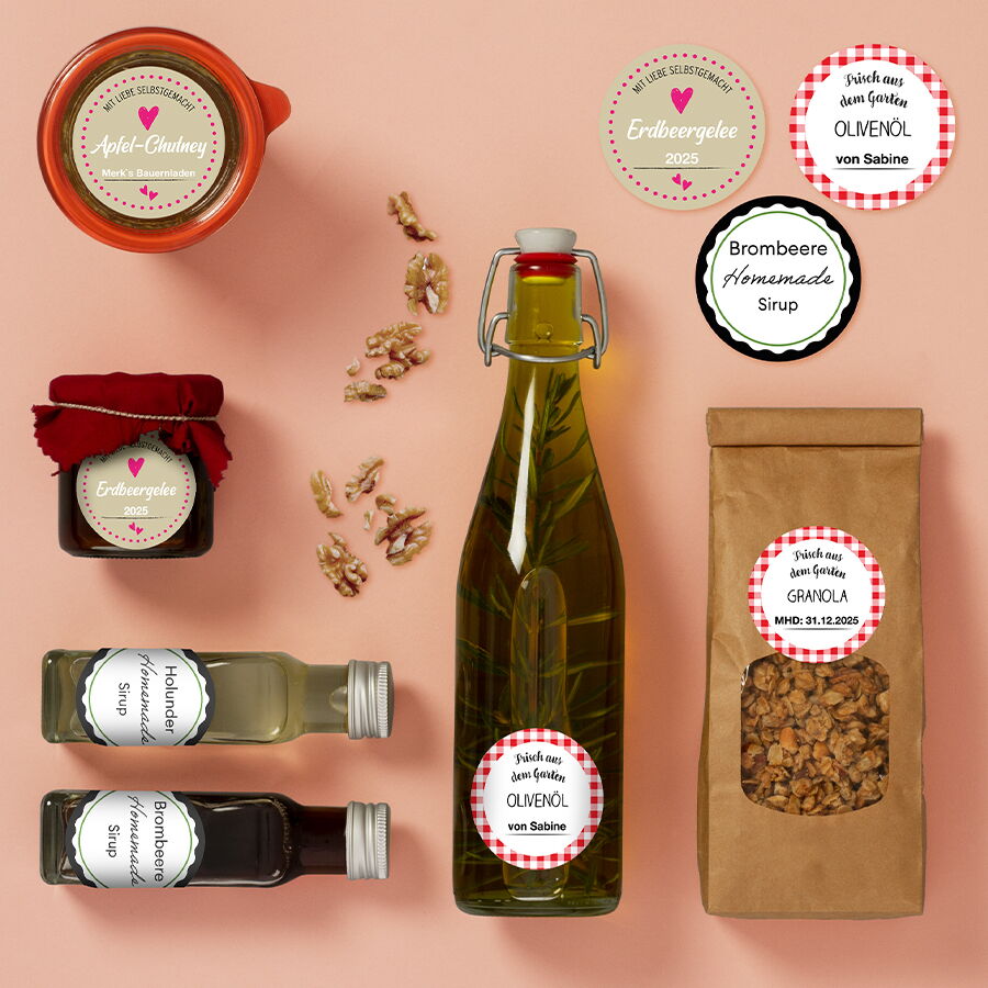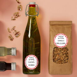 Ob du frischgepresster Apfelsaft, Waschmittel aus aus Kastanien, Pasta oder selbstgemachtes Kräuteröl herstellen möchtest – mit den runden Klebeetiketten von Stickerella wird aus jedem Homemade-Produkt ein kleines Unikat. Die Etiketten (Ø 55 mm) sind personalisierbar und machen deine hausgemachte Vorräte oder Geschenke aus der Küche nicht nur praktisch, sondern auch wunderschön. Egal zu welcher Jahreszeit: Diese personalisierten Sticker geben selbstgemachten Produkten den letzten Schliff.